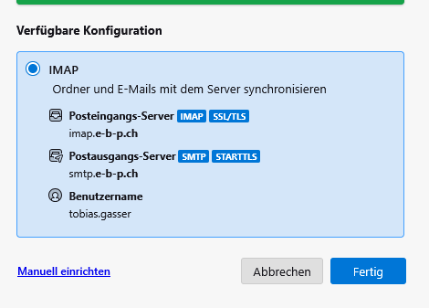 | Wobei anstelle von imap und smtp auch mail.e-b-p.ch korrekt ist.