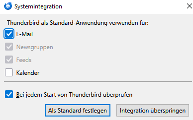 Falls Sie Thunderbird NICHT als Standard für eMail verwenden wollen (z.Bsp weil Sie primär mit Outlook arbeiten) sollten Sie den Haken bei Bei jedem Start.. entferenen und müssen dann auf Integration überspringen klicken. | |